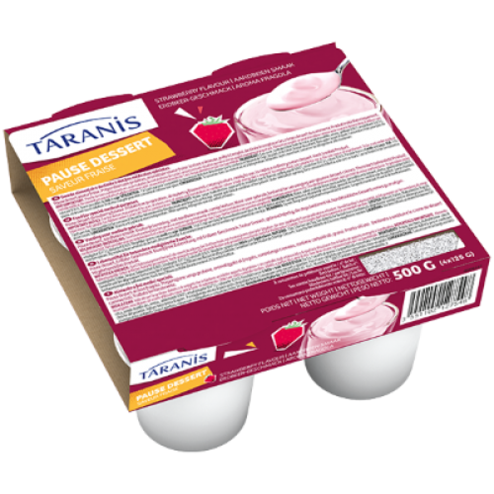 Dessert met aardbei smaak, 4 porties Taranis klaar voor gebruik.