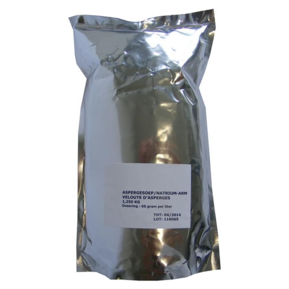 TARWEbloem, maïszetmeel, gemodificeerd zetmeel, groentepoeder en -stukjes (asperges 10%, peterselie), plantaardige olie (palm, zonnebloem), MELKpoeder, maltodextrine, dextrose, plantaardig vet (geheel gehard palmvet), aroma (bevat SOJA), weipermeaat (MELK en LACTOSE), kruiden en specerijen extracten (bevat SELDER), natuurlijke kleurstoffen: curcuma en paprika, verdikkingsmiddel: guarpitmeel, gistextract, smaakversterkers: E621 en E622, kaliumchloride, LACTOSE (MELK), MELKeiwit, natuurlijk antioxidant: rozemarijnextract, antiklontermiddel: E551, zout.